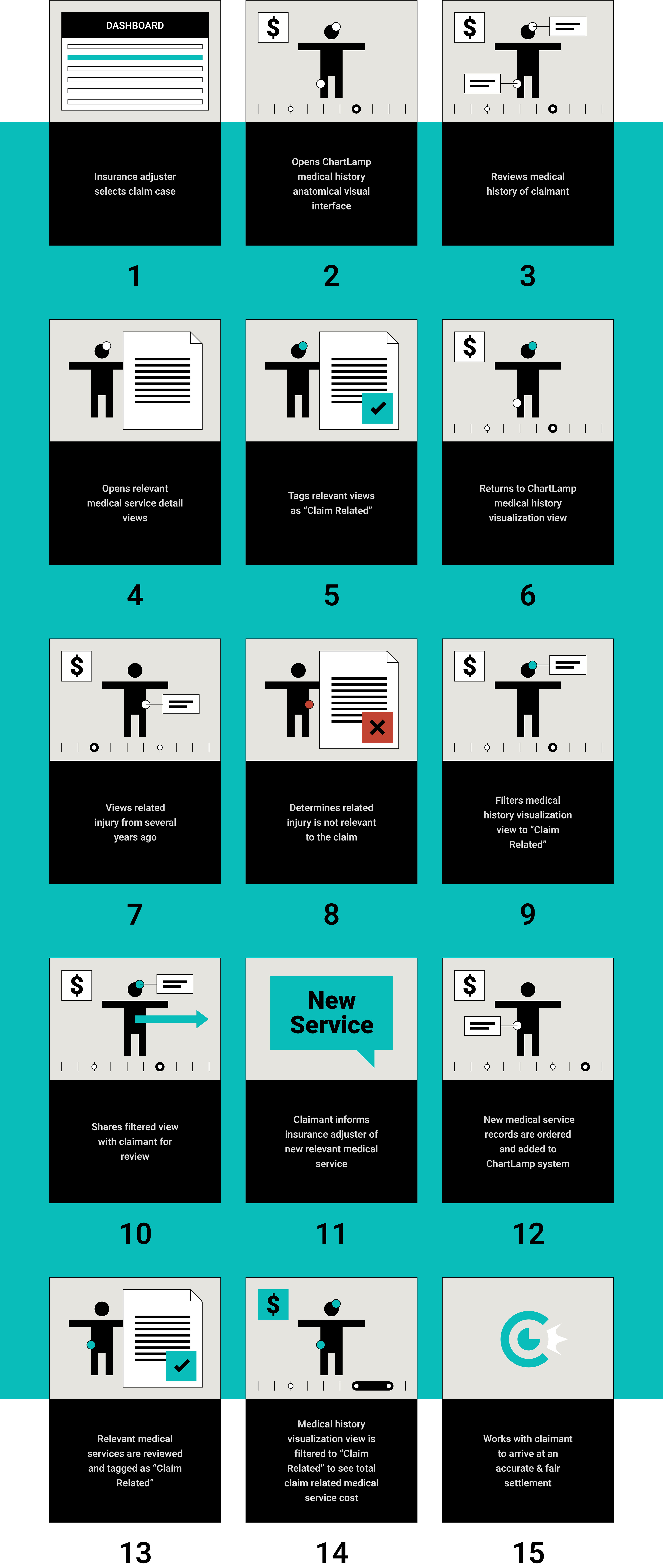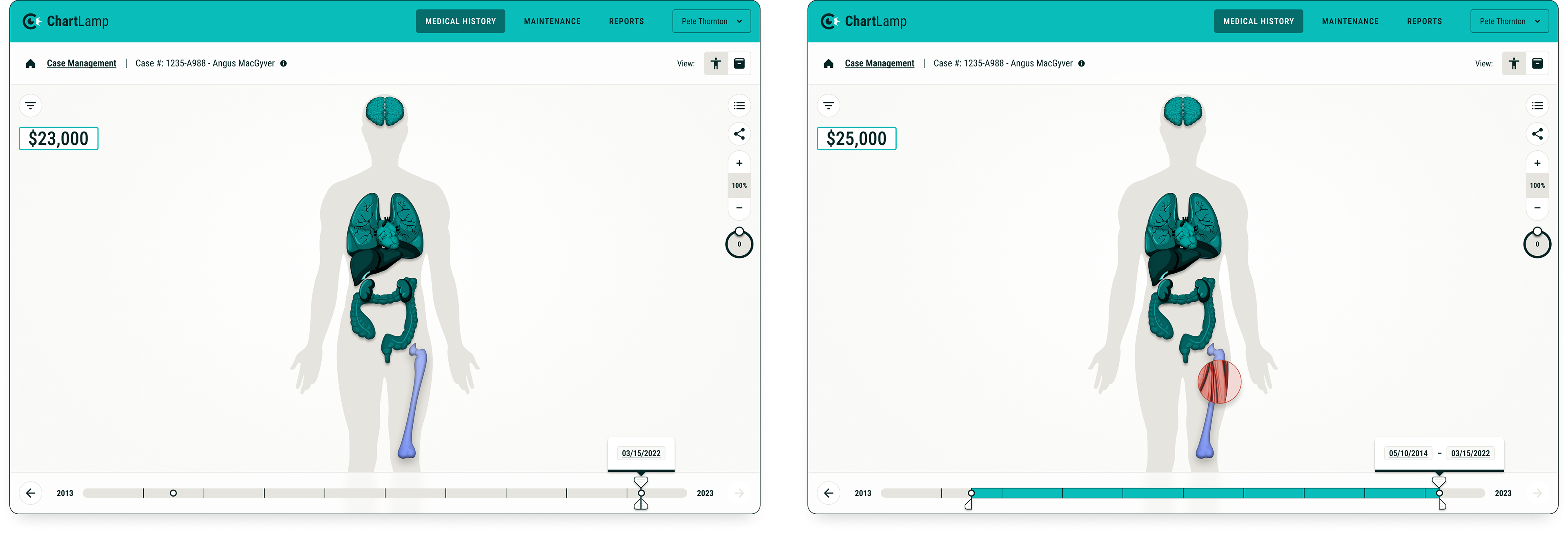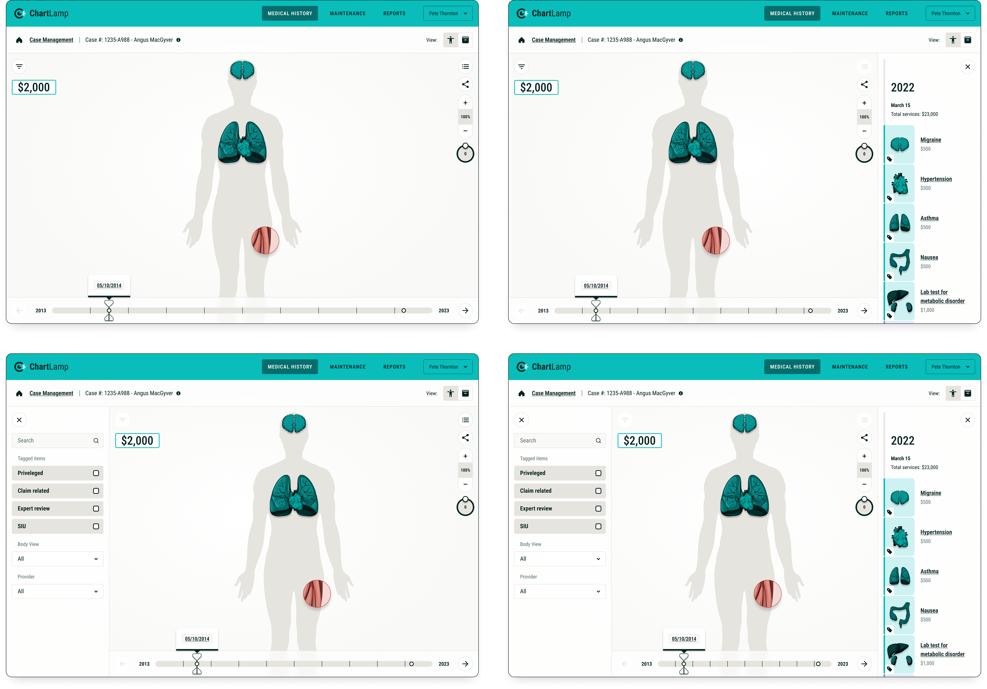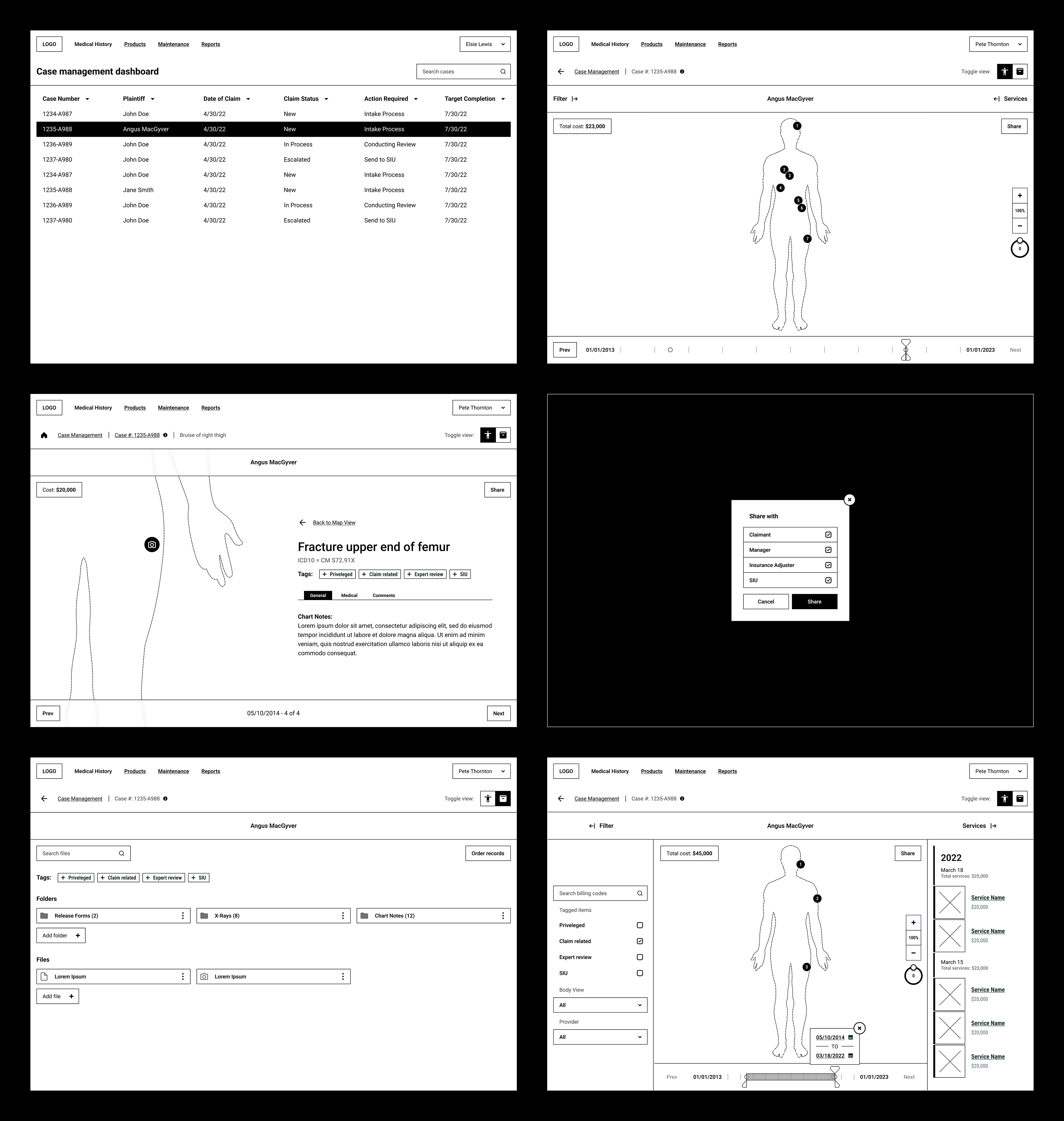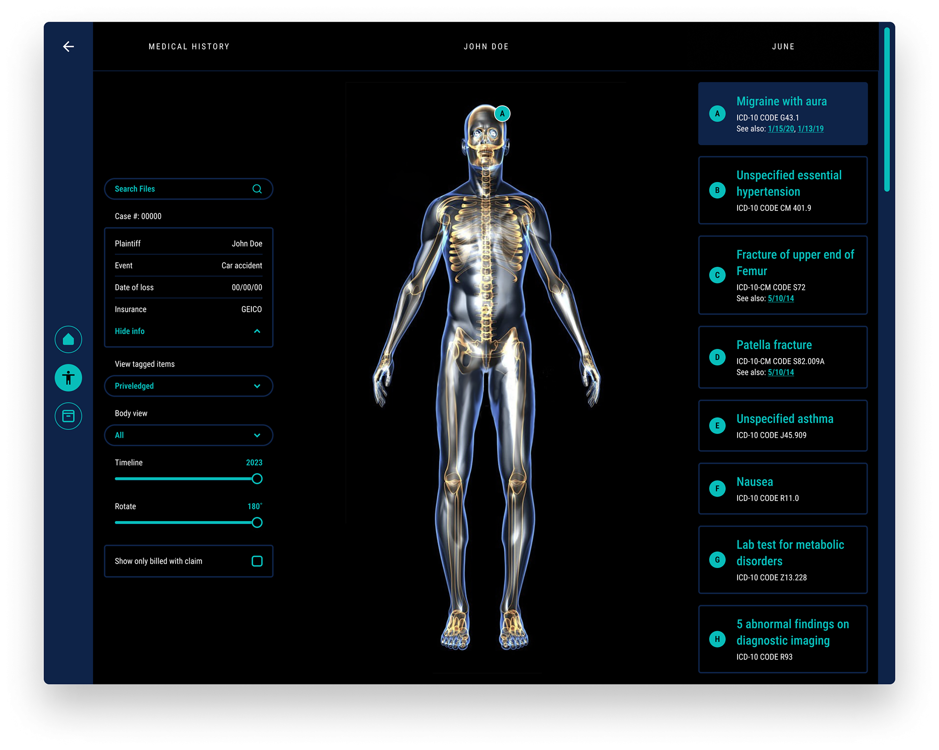 Our team was approached with a vision for a product that would translate an individual's medical history (in the form of vast amounts of text-based medical codes, files and documentation) into an easy to process, visual format. Our task was to create a prototype that could be used to pitch the idea to investors. The application would be useful to anyone with a need to review medical records in a quick and efficient manner, but would initially be targeted toward Insurance adjusters.